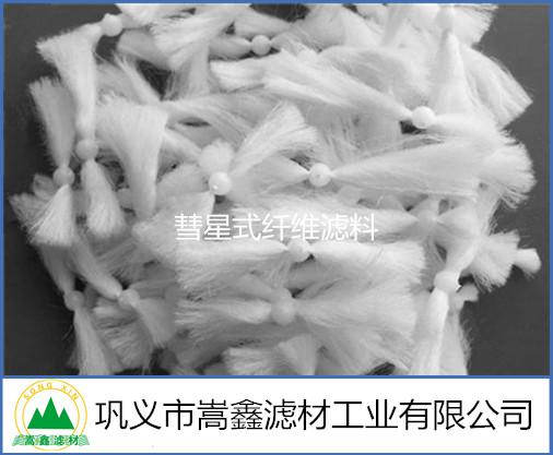 彗星式纖維濾料由星核和纖維束組成,其特征在于:纖維絲束穿過星核的中心并被星核所固結。彗星式濾料的星核一般為圓球形或橢圓形。